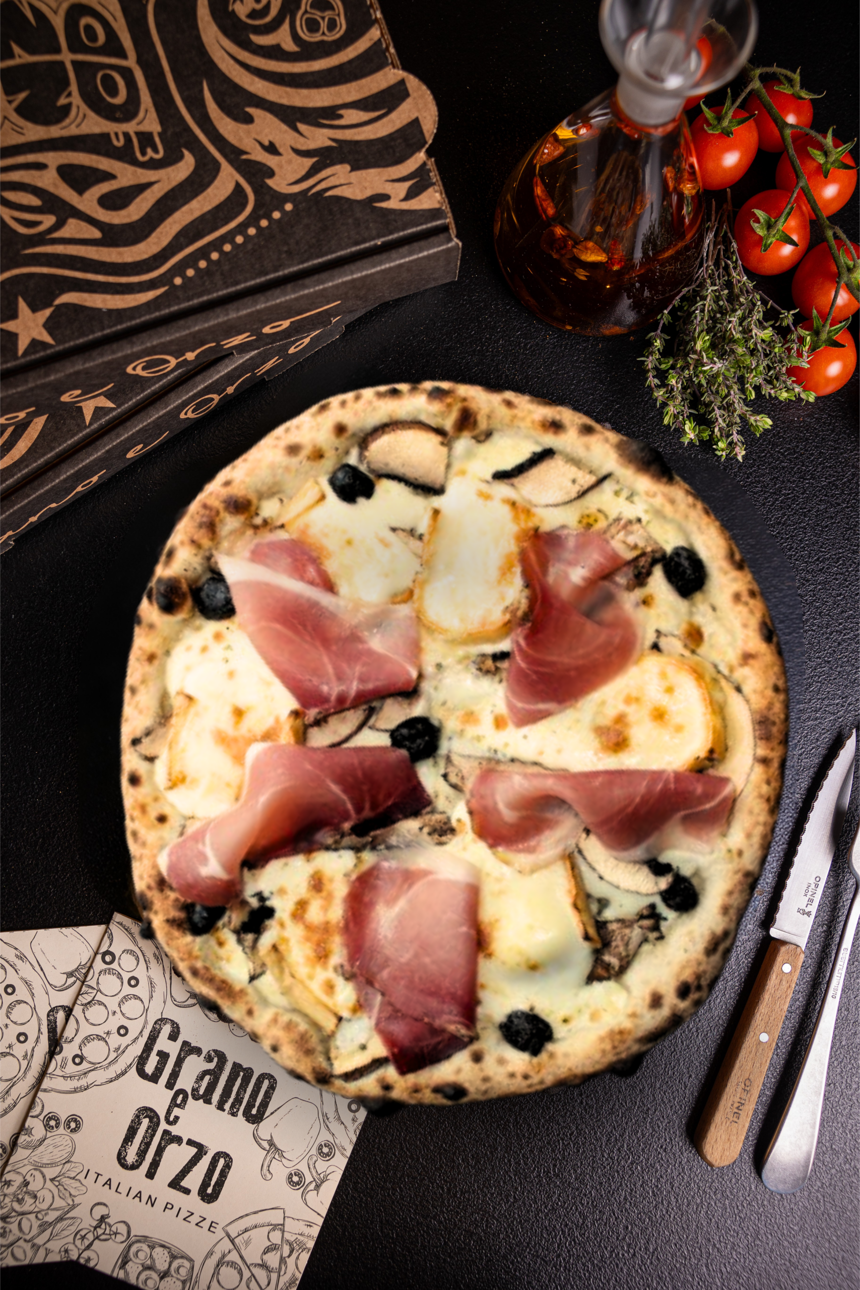 Mozzarella Fior di Latte, taleggio, champignons, speck, olives, origan