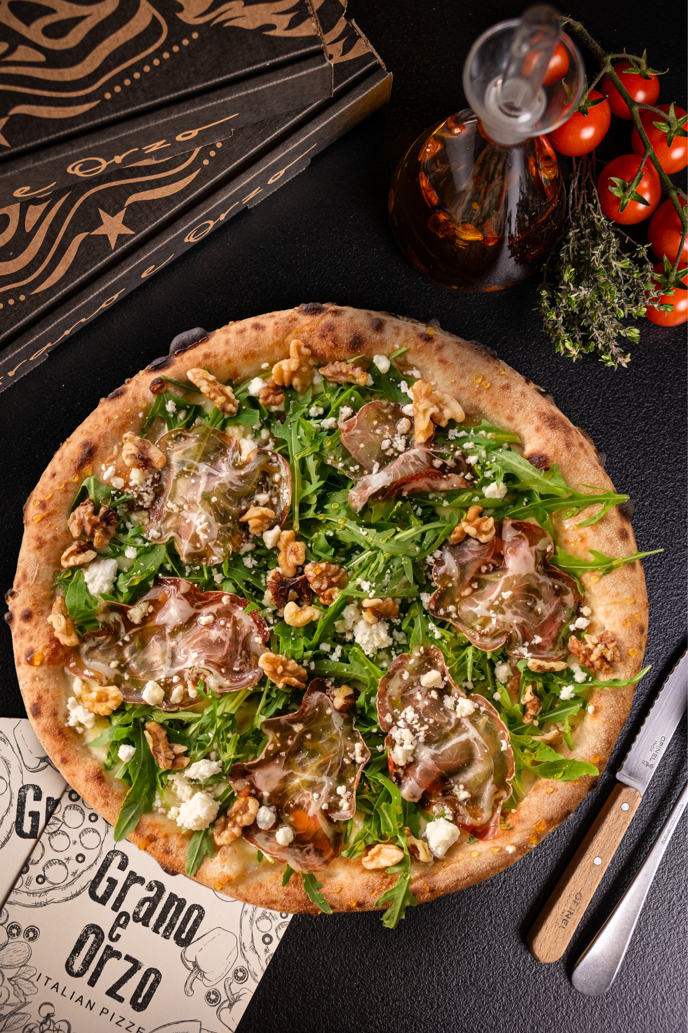 Mozzarella Fior di Latte, formaggio di capra, roquette, cerneaux de noix, coppa di Parma, miel
